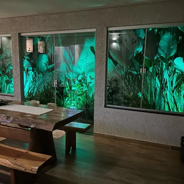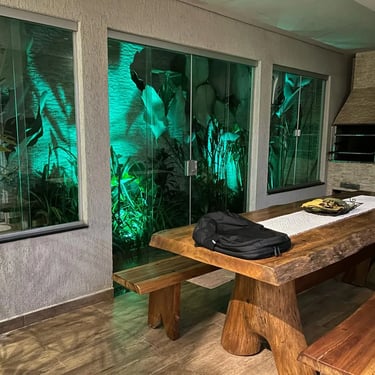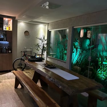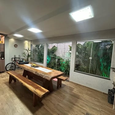 O destaque fica por conta do espaço gourmet, projetado para quem ama reunir amigos e família. Ele conta com churrasqueira, bancada ampla, bar, cooktop e uma bela mesa de madeira de 2,5 metros, que traz charme e personalidade ao ambiente.