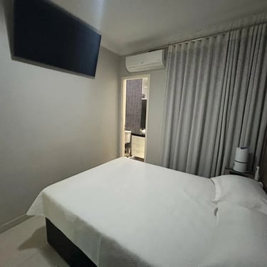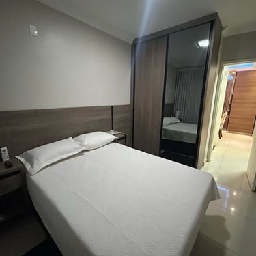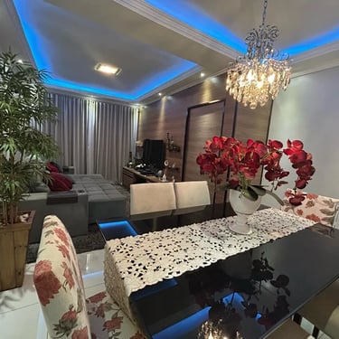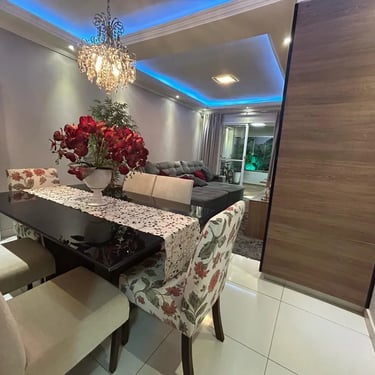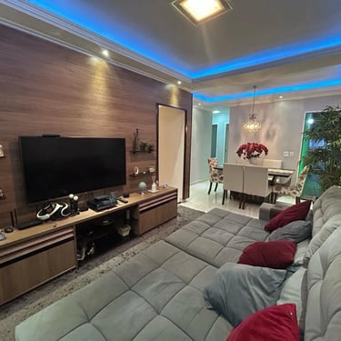 A área social encanta pela integração: sala de estar e jantar unidas em um espaço amplo e acolhedor, com painel planejado, luminárias dicroicas e iluminação LED RGB, criando cenários perfeitos tanto para momentos de descanso quanto para receber convidados.